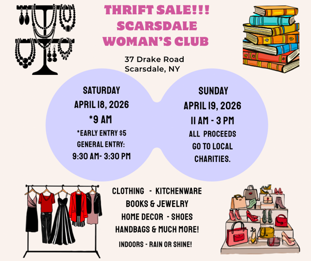 Dentro de Scarsdale Woman’s Club una venta temporal es el sábado 18 ed avril, 9-3:30 y domingo 19 de avril, 11-3. Ropa para hombres, mujeres y ninos, joyas, zapatos, bolsos, decoración para el hogar, ropa de cama, utensilios de cocina y mucho más – Tambien libros. Mucho espacio de estacionamiento gratuito y cerca del # 40 Beeline parada de autobús en Post Road and Crane Road. La dirección es 37 Drake Road, Scarsdale, NY 10583.